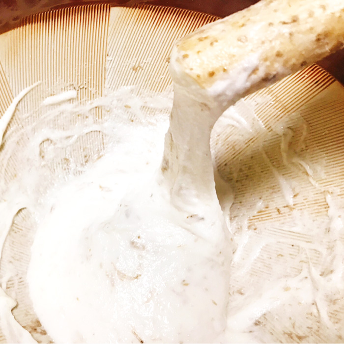 3.最後にすり棒で擦ります。とろろに空気が含まれきめ細やかな仕上がりになります。また、粘りがグンと増します。その後、出汁や醤油を少しづつ入れて味を調えます。